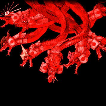 its eyes are like akakagachi, it has one body with eight heads and eight tails. moreover on its body grows moss, and also chamaecyparis and cryptomerias. Its length extends over eight valleys and eight hills, and if one looks at its belly, it is all constantly bloody and inflamed.